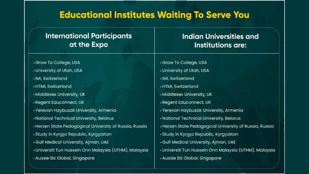 The exhibition will host top-notch universities from the US, UK, Canada, Europe, Russia, Armenia, Belarus, Singapore, Malaysia, and most Importantly India as well.